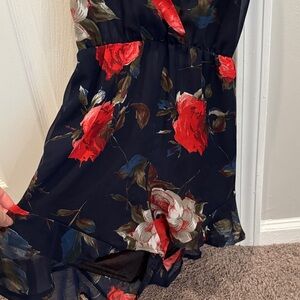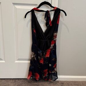 Floral halter top romper with sheer floral fabric lined with a black silky fabric. Fits like a standard small.