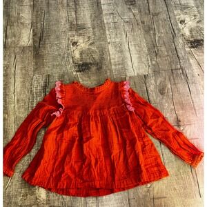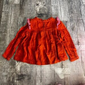 Boho-inspired long sleeve top crafted from a textured gauze fabric in a vibrant burnt orange hue. This charming piece features a smocked bodice for a comfortable fit, delicate ruffle trim at the shoulders with pink eyelet lace accents, and a flowy peplum-style hem. Elasticized cuffs and a ruffled neckline complete the sweet, vintage-inspired look, making it a perfect choice for autumn layering or festive occasions. Cat & Jack size M 7/8