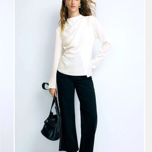 Great under a blazer office blouse is a sophisticated piece with a sleek, ribbed texture, long sleeve, ruched shoulder, Career, networking, conference, happy hour, office event.