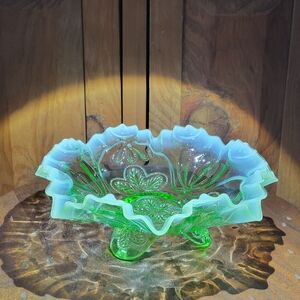 Jefferson "Meander" Green Opalescent Bowl. It is an Early American Pattern Glass (EAPG) piece, circa 1908. The bowl features a fiery green opalescent color, a ruffled crimped rim, and three prominent feet. No chips or cracks and is in Super Excellent Original Condition. $55