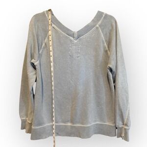 Soft French terry sweatshirt features a relaxed silhouette with a deep V-neckline and raglan sleeves. Designed with a mineral wash finish for a lived-in look, it includes exposed contrast stitching and ribbed trim at the cuffs and hem. The lightweight fabric makes it an ideal layering piece for casual lounging or everyday wear. This item is in excellent pre-owned condition.