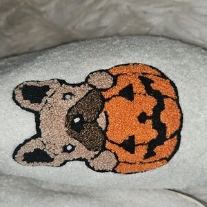 Keep things cozy and spooky with our Frenchie Halloween Slippers! Featuring the cutest French Bulldog peeking out of a pumpkin, these fuzzy Spooky Frost slippers are perfect for dog lovers and Halloween fans alike. Detailed in Pumpkin Pop and Spiced Bark accents, they’re soft, warm, and comfy — the perfect mix of festive and cozy.
