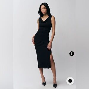 Chic black midi dress with sleeveless design. Features a flattering fit and side slit. Ideal for versatile styling.