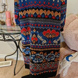 Elevate your wardrobe with this stylish FarmRio Ainika intarsia-knit cardi-coat, a pre-owned gem in excellent condition, size small. The cardi-coat features a unique blend of 65% acrylic, 35% polyamide, and 10% wool, making it a cozy yet chic addition to any outfit.