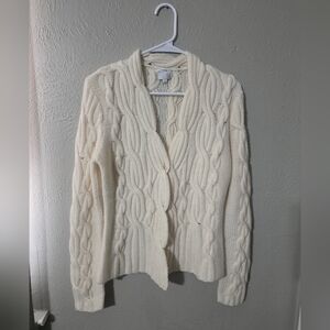 100% cashmere, Chic cable knit cardigan by TSE. Soft cream color. Perfect for layering.