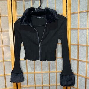 Stylish black zip up sweater with faux fur trim. Perfect for a sophisticated look. New, never worn. Size XS.