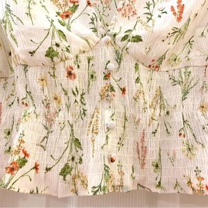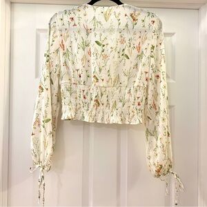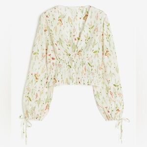 New without tags. H&M SHORT V-NECK BLOUSE Smocked Balloon Sleeve Cream Floral. Size small. Short blouse in woven fabric. Low-cut V-neck and decorative, covered buttons at front. Smocking at waist, ruffle trim at hem, long balloon sleeves, and cuffs with narrow elastic and ties.