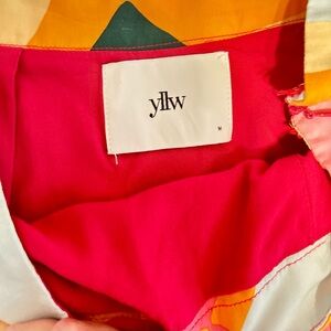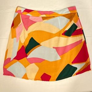 Add a pop of color to your wardrobe with this eye-catching geometric mini skirt. Featuring a vibrant mix of orange, pink, and green, it's perfect for any occasion.