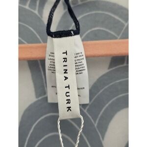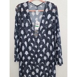 Trina Turk Swim & Spa Collection cover-up dress showcases a striking navy blue and white geometric arch print on a lightweight mesh fabric. This stylish piece features a deep V-neckline accented by a textured gold-tone ring detail at the center, creating a sophisticated focal point. Designed with long sleeves and a relaxed silhouette, it offers effortless elegance for poolside lounging or resort wear. The sheer, stretchy material ensures a comfortable fit while maintaining a chic, modern aesthetic.