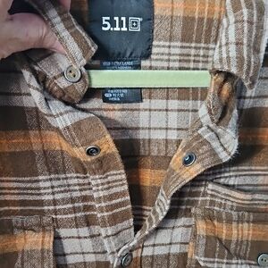 Stylish brown plaid flannel shirt by 5.11. Features snap button-up front and dual chest pockets. Great preowned condition with just the flannel piling. No stains or holes Y4