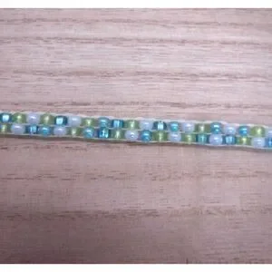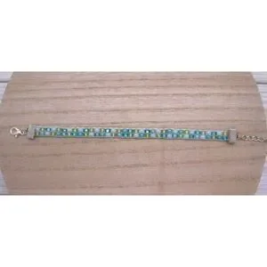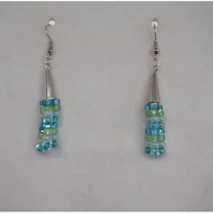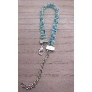Bracelet is hand beaded using a loom. Sets are made with aqua and seafoam green Czech glass beads. Silver tone ribbon crimp ends with a lobster clasp closer. Earrings and necklaces are hand strung.