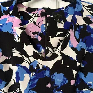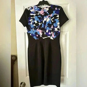 This sheath dress by Worthington features a vibrant floral pattern in blue and pink on the top portion, with a solid black bottom half. The dress has short sleeves and a v-neck.