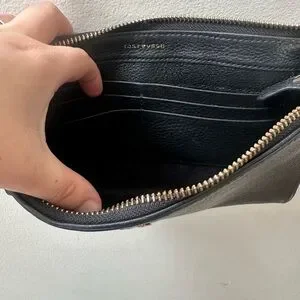 Black leather Tory Burch crossbody bag with gold chain/hardware. The back has a magnetic closure pocket, which is great for holding your phone. The inside has several card slots and a little pocket for cash. This purse is roomier than it looks, as I’m able to fit my phone, cards, cash, and very small wallet, chapstick, and my car keys in it. Love this bag but I have several others. It’s in excellent condition! No noted flaws! From a smoke free home.