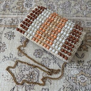 This chic beaded crochet clutch showcases a stunning tan and brown pattern. Ideal for elevating your style with a touch of elegance.