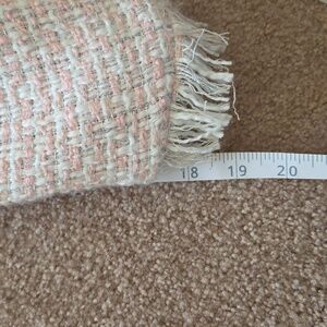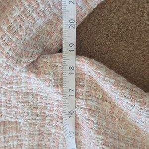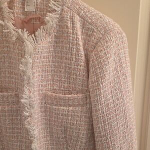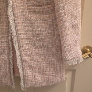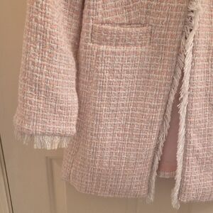 Chic tweed blazer with fringe accents. Elegant pink and white design. Ideal for sophisticated style.