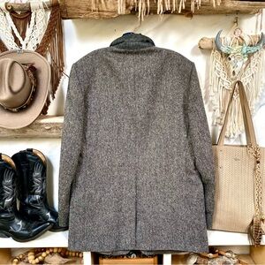 Beautiful tweed timeless medium grey salt/pepper w specks of dark plum,red ,blue,green throughout ✨🤩goes w everything!! this gem will keep you warm this fall/winter specially if layered up w blanket wool scarf or over your fav wool vest or hoody ✨