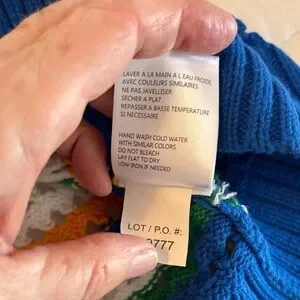 Colorful striped sweater with crew neck. Features blue, green, and white patterns. Perfect for casual outings.