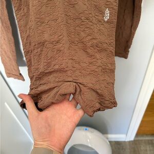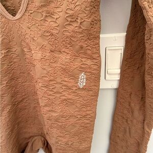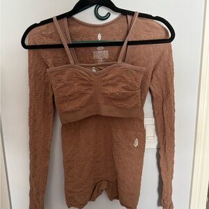 Turn heads in this super sleek set featuring a textured, long sleeve onesie with bandeau detail at center for a forever flattering, layered look.