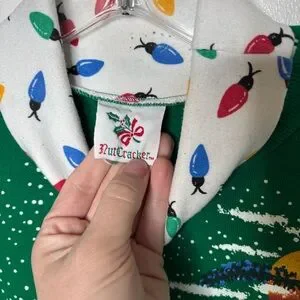Vintage Nutcracker holiday sweatshirt featuring snowy kitten scene with glitter accents and festive Christmas lights turtleneck detail. Classic 80s/90s cozy oversized fit with ribbed cuffs and hem. No size tag — fits like a modern XL based on measurements. Wear to turtleneck area including marks and light pilling; otherwise in good vintage condition.