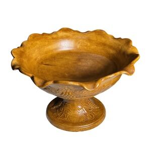 Charming vintage Amber color footed compote, fruit bowl. Handcrafted in pottery and signed by HW on April 24, 1972. A warm brown glaze covers the bowl, accentuating the embossed grape and leaf design around the circumference of the bowl and foot. The pedestal base elevates the piece, while the scalloped rim adds a touch of elegance. A beautiful centerpiece or decorative accent, this vintage bowl brings character to any space.