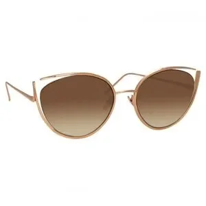 The Fontaine sunglasses from Linda Farrow feature a cat-eye silhouette, combining timeless elegance with the glamour of the jet set era. These sunglasses are crafted from 18-22 carat white gold-plated hypoallergenic lightweight titanium. They experiment with negative space to create a floating effect for the platinum lenses.