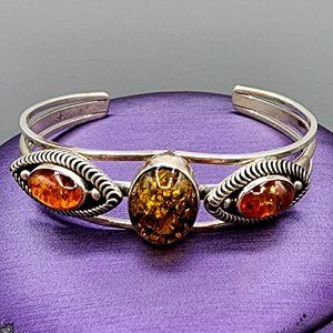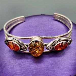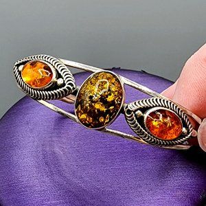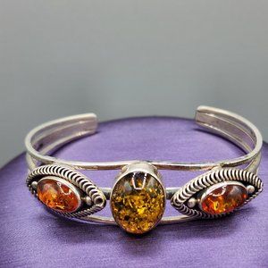 Vintage Navajo Signed Baltic Amber Three Stone Handmade Sterling Silver Bracelet
