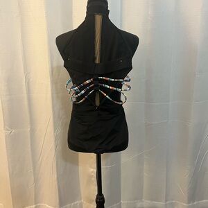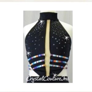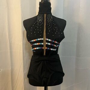 Stylish black halter top dance costume featuring multi-color straps and Swarovski Rhinestones. My daughter wore it for a solo costume. She only wore it a few times…it’s a beautiful costume!