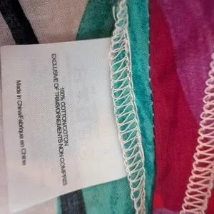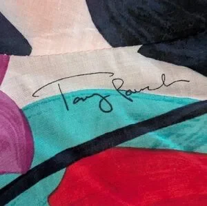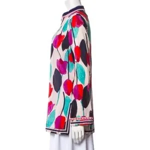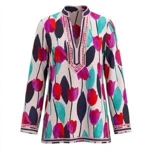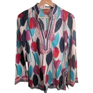 Tory Burch cotton tunic in multicolor tulip print. Size 0. Features embroidered split neckline with navy, pink, and coral trim detail. Hidden side seam zipper closure. Long sleeves with decorative hem trim.