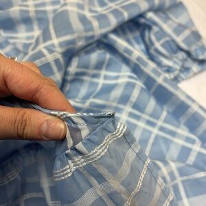 Stylish blue plaid blouse with a flattering V-neck design. Perfect for casual outings.