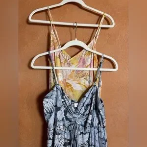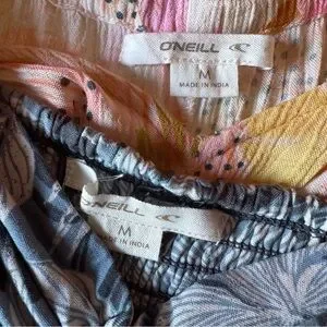 Bundle of two O’Neill tropical wide-leg jumpsuits in size Medium. Both feature lightweight, flowy fabric with adjustable straps and relaxed summer silhouettes.