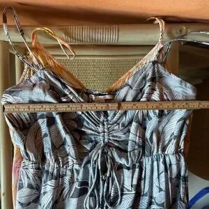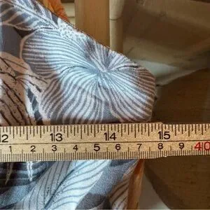 • Blue/gray tropical print with ruched front detail and adjustable tie