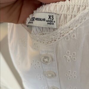 Eyelet mini dress from Hollister in regular length. Has adjustable straps and stretchy back. Features front buttons and a corset “v” style top with crochet trim. 100% cotton