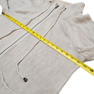 This item is a sweater cardigan jacket knitwear top outerwear Lane Bryant plus size curvy modern classic casual chic cozy fashion trendy statement designer retail apparel cream ivory beige off-white neutral solid cable knit textured chunky ribbed loose fit relaxed A-line standard length tunic oversized flowy zip front full zip zipper dual zipper pockets drawstring hoodie mock neck high collar bell sleeve flared sleeve three quarter sleeve 3/4 sleeve bracelet length sleeve short sleeve wide cuff drop shoulder knit soft knit yarn cotton blend acrylic nylon rayon viscose polyester stretch lightweight midweight chilly day warm cozy comfort winter fall spring all seasons layering piece everyday wear office casual outings travel weekend lounge shopping