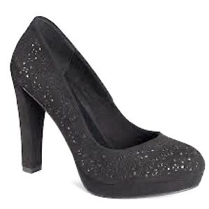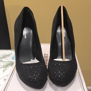 JC Marcy black pumps have a pretty cutout design with metallic underlay, 4” heel