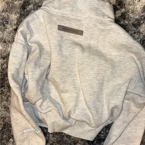 Cozy light gray sweater with a stylish high neck. Features 'Essentials' branding. Perfect for casual wear.