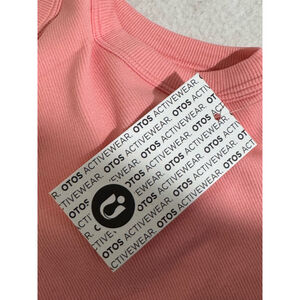 This is a new with tags OTOS activewear tank top, style YT8883, in size M. The garment is made of 92% nylon and 8% spandex. It features a ribbed texture and a built-in bra with removable pads. The tank top is a solid peach pink color. The item is in pristine condition, with no visible imperfections. The tank top has wicking, flat seams, and four-way stretch.