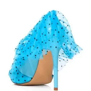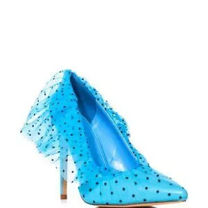 A must for any closet, The AZALEA WANG" PERFECTED PERSONIFIED " Tulle Polka Dot Pump In Blue is made from a faux leather upper and features a pointed toe silhouette, a cushioned insole, a stiletto heel, an extended rubber sole, and a step-in fit. Complete with a flirty, polka dotted mesh ruffle detail throughout.