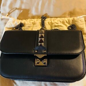 Sleek and stylish black Valentino Garavani black leather bag featuring a chic gunmetal chain strap and rockstud hardware. Ideal for elevating any outfit.