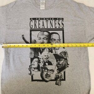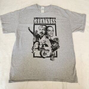 The Vintage 90s Black History Leaders "Tribute To Greatness" T-shirt is a unisex graphic print shirt featuring a crew neckline and short sleeves. Made by Gilden, the black shirt in size large is machine washable and has a regular fit. Perfect for any season, this t-shirt is a tribute to great leaders in Black history, making it a stylish and meaningful addition to any wardrobe.