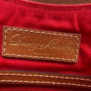 Classic signature DB coated canvas with tan leather trim and gold hardware. Slouchy hobo silhouette with zip top closure and red interior lining. Spacious everyday bag that fits wallet, phone, planner, and more.