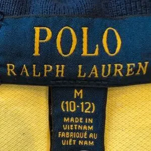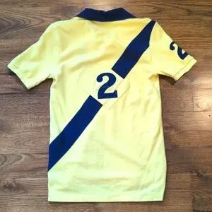 EXCELLENT USED CONDITION This boys Polo Ralph Lauren yellow polo shirt is a size medium(10/12). It has a navy blue collar with 2 buttons at the neck, navy big pony logo, navy stripe on the front and back, and a navy 2 on the sleeve. Made of 100% Cotton. Measurements are 26 inches from shoulder to bottom and 15 inches armpit to armpit.