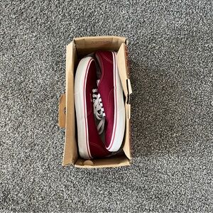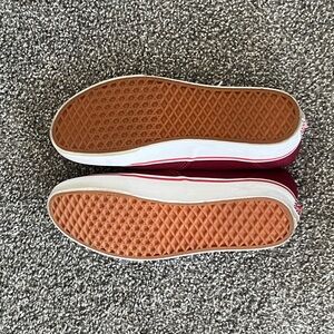 Worn once. Red canvas shoes with white laces. Classic Vans style.