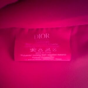 Chic red pouch with Christian Dior branding. Ideal for essentials Bare Minerals Foundation (Med Cool 3.5) , AMINNAH lip and cheek color, felt tip eyeliner and Clinique Take the Day off.