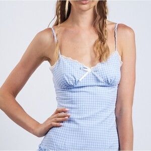 Charming blue gingham dress featuring a ruffle hem and delicate straps. Perfect for a casual day out.