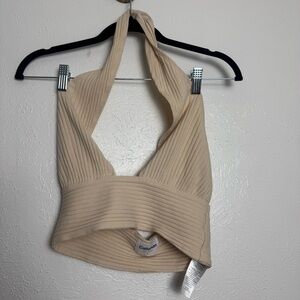 Callahan Knitwear Sandy Ribbed Halter Deep Plunge Crop Top. Open back, backless, party, festival, boat, yacht, night out, club, classy sexy. Size women’s small. Cotton blend. Measurements laying flat are approximately Chest- 14 Length- 16
