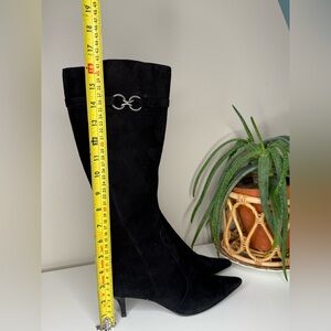 Classic black suede Bandolino knee-high boots with a sleek pointed toe and elegant kitten heel. Timeless silhouette that pairs effortlessly with dresses, skirts, or skinny jeans. The silver hardware detail adds a subtle polished finish.