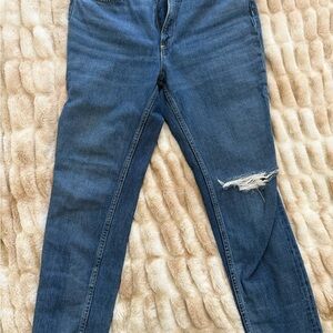 Chic blue skinny jeans with a stylish distressed knee. Perfect for everyday wear.