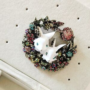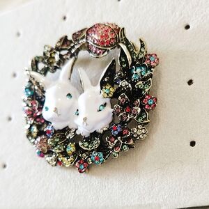 Delightful brooch featuring white rabbits nestled in a vibrant floral arrangement. A perfect accessory to add charm and color to your attire.
