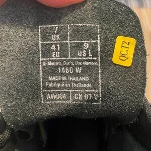 Dr. Martens 1460 W black leather lace-up boots. Classic 8-eye boot with yellow welt stitching and air-cushioned soles. Made in Thailand.