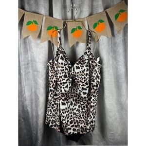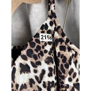This is a Bar III women's one-piece swimsuit in size 24W with a natural animal print design. It features a cowlneck, high neckline, and cutout at the front and back. The swimsuit has self-tie halter straps and is made of a nylon/spandex blend with a polyester lining. It includes full coverage, removable soft push-up cups, and is recommended for hand wash only.